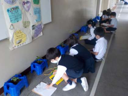 「やさいをそだてよう」の単元でミニトマト、ししとう、ピーマン、枝豆、オクラ、ナスを植えました。今日は成長の様子をスケッチしました。どのように育つのか楽しみですね(^^♪