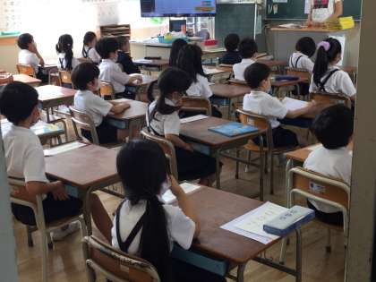 看護当番の先生からは、「授業の時など、座る姿勢ちゃんとできていますか?背筋が伸びていますか?」と話がありました。一年生の教室をのぞくと、しっかり背筋が伸びていました。