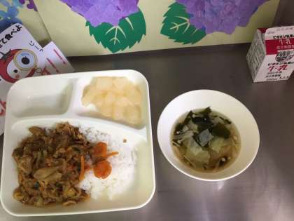今日の給食は、和風カレー丼、牛乳、すまし汁、和なし(カット缶)です。なしは、日本なし、中国なし、西洋なしの3種類があります。給食には日本なしと西洋なしが出ます。生で食べることがほとんどですが、最近は缶詰やジュースなどもつくられています。給食に出る和なし(カット缶)は、日本なしの幸水・豊水・二十世紀などを使っています。食べやすいように一口サイズにカットしています。