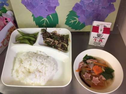 今日の給食は、ごはん、牛乳、チンジャオニューロウスー、ハムと野菜の中華スープ、えだまめ、です。チンジャオニューロウスーは、ピーマンと牛肉を細く切って炒めた中国の料理です。中国語で「青椒(チンジャオ)」はピーマン、「牛肉(ニューロウ)」は牛肉、「絲(スー)」は細切りという意味です。