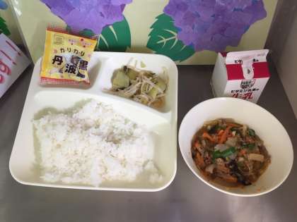 今日の給食は、ごはん、牛乳、マーボーはるさめ、チンゲンサイともやしの甘酢あえ、いり黒豆です。はるさめは、めんのような形をした食べ物です。中国で昔から食べられてきました。はるさめは、じゃがいもやさつまいも、緑豆という豆のでんぷんから作られています。給食では、じゃがいものでんぷんから作られたはるさめを使っています。