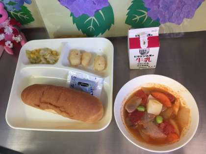 今日の給食は、コッペパン、ブルーベリージャム、牛乳、いかてんぷら、フレッシュトマトのスープ煮、サワーソテー、です。トマトには、ビタミンCやカロテン(皮ふやのど、鼻のねんまくを丈夫にし、体の抵抗力を高める)や食物せんい(おなかの掃除をする)が含まれています。今日の「フレッシュトマトのスープ煮」には生のトマトが使われています。