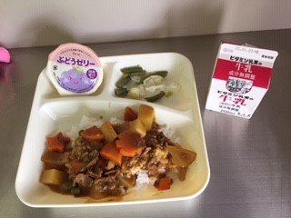 今日の給食は、ビーフカレーライス、牛乳、野菜のピクルス、ぶどうゼリーです。今日のビーフカレーライスは米粉からできています。小麦アレルギーを考慮したメニューとなっています。辛さもほどほどで、牛肉やジャガイモがたくさん入っています。暑い季節はカレーがおいしいですね。