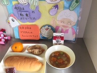 今日の給食は、コッペパン、いちごジャム、牛乳、あげぎょうざ、鶏肉ととうがんの中華煮、みかん(冷凍)です。