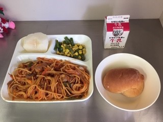 今日の給食は、黒糖パン、牛乳、イタリアンスパゲッティ、グリーンアスパラガスのサラダwithノンエッグドレッシング、なし(豊水)です。