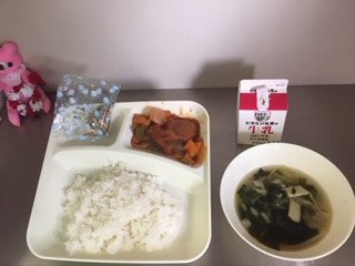 今日の給食は、ごはん、牛乳、酢豚、中華スープ、アーモンドフィッシュです。