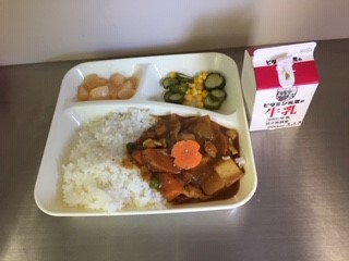 今日の給食は、チキンカレーライス(米粉使用)、牛乳、きゅうりとコーンのサラダ、白桃(カット缶)です。