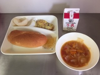 今日の給食は、コッペパン、マーマレード、牛乳、豆乳マカロニグラタン(米粉使用)、トマトスープ、なし(二十世紀)、です。