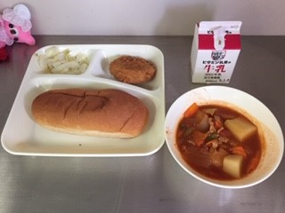 今日の給食は、黒糖パン、牛乳、チキンレバーカツ、ケチャップ煮、キャベツのバジル風味サラダ、です。