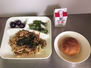 今日の給食は、黒糖パン、牛乳、焼きそば、オクラの甘酢あえ、ぶどう(巨峰)です。