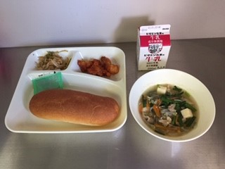 今日の給食は、コッペパン、りんごジャム、牛乳、ヤンニョムチキン、もやしととうふのスープ、切干しだいこんのナムルです。