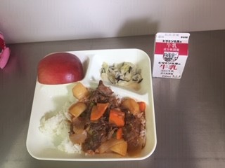 今日の給食は、ハヤシライス(米粉)、牛乳、キャベツのひじきドレッシング、りんご、です。