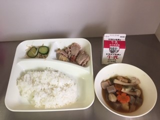 今日の給食は、ごはん、牛乳、豚肉のねぎじょうゆ焼き、ふきよせ煮、きゅうりともやしの甘酢あえ、です。