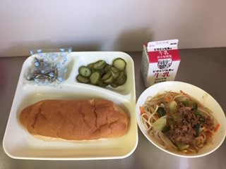 今日の給食は、黒糖パン、牛乳、タンタンめん、きゅうりの甘酢づけ、ミニフィッシュ、です。