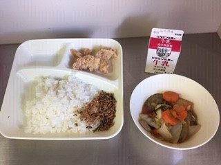 今日の給食は、ごはん、牛乳、鶏肉のたつたあげ、あつあげと野菜の煮もの、おかかなっ葉です。