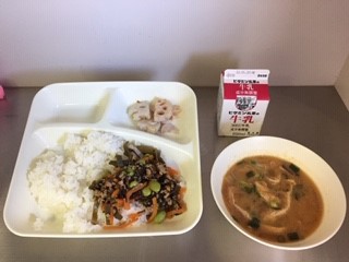 今日の給食は、もずくと豚ひき肉のジューシー、牛乳、さつまいものみそ汁、焼きれんこん、です。