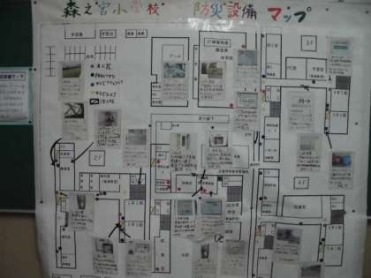 4年生の学年掲示板には、森之宮小学校内にある防災設備を調べてマップにしたものが掲示してありました。細かいところまでよく調べていて、とてもわかりやすいマップに仕上がっていましたよ(*^^*)