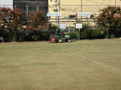 ご存じの通り、本校は芝生の運動場です。この芝生、やはり放置というわけにはいかなくて、定期的なメンテナンスが必要となります。今日は業者の方にエアレーション作業をしてもらいました。エアレーションとは、芝生の根の更新作業のことで、地面に穴をあけるシンプルなものです。これにより