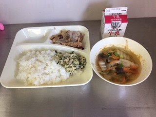 今日の給食は、ごはん、牛乳、豚肉のスタミナ焼き、すまし汁、とりなっ葉いため、です。