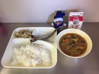 今日の給食は、ごはん、牛乳、焼きししゃも、和風カレー汁、まいたけとキャベツのいためもの、です。