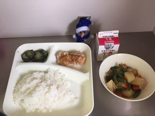 今日の給食は、ごはん、牛乳、あげどりのねぎだれかけ、豚肉とじゃがいもの煮もの、きゅうりの赤じそあえ、です。