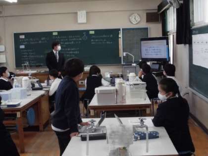 今回は「物の温度と体積」の単元で水も空気と同じように、温度によって体積が変わるのかを調べていました。丸底フラスコに入れた水を温めたり、氷水で冷やしたりと、各班で役割を決めてスムーズに取り組んでいました(^^)/