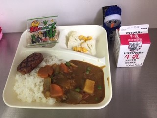今日の給食は、ハンバーグカレーライス、牛乳、カリフラワーのピクルス、豆こんぶ、です。