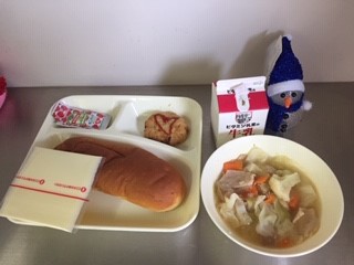今日の給食は、おさつパン、牛乳、とうふハンバーグ、カリフラワーのスープ煮、スライスチーズ、です。