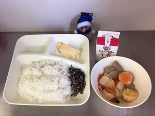 今日の給食は、ごはん、牛乳、卵どうふ、一口がんもと野菜の煮もの、魚ひじきそぼろ、です。