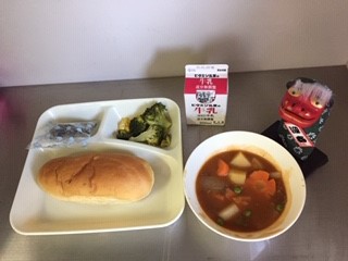 今日の給食は、おさつパン、牛乳、ビーフシチュー、ブロッコリーとコーンのサラダ、ミニフィッシュ、です。