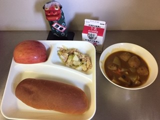 今日の給食は、黒糖パン、牛乳、ミートボールと野菜のカレー煮、ツナとキャベツのソテー、りんご、です。
