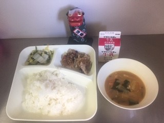 今日の給食は、ごはん、牛乳、豚肉のごまだれ焼き、みそ汁、きくなとはくさいのおひたし、でした。