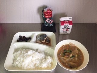 今日の給食は、ごはん、牛乳、さごしのしょうゆだれかけ、みそ汁、黒豆の煮もの、です。