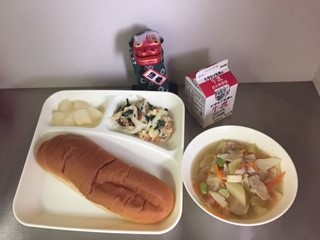 今日の給食は、黒糖パン、牛乳、ほたて貝のグラタン、スープ、和なし(カット缶)、です。