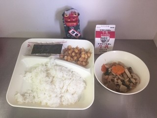 今日の給食は、ごはん、牛乳、筑前煮、じゃこ豆、焼きのり、です。