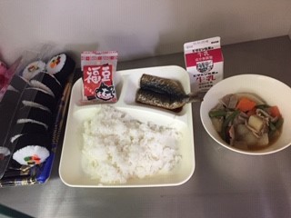 今日の給食は、ごはん、牛乳、いわしのしょうがじょうゆかけ、含め煮、いり大豆、です。給食では、節分の行事献立として、「いり大豆」と「いわしのしょうがじょうゆかけ」が登場します。
