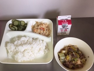 今日の給食は、ごはん、牛乳、すき焼き煮、もやしとささみのいためもの、きゅうりのゆず風味、です。