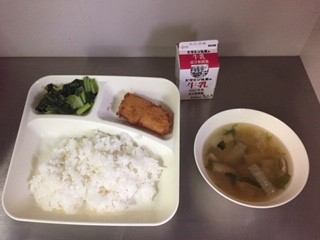 今日の給食は、ごはん、牛乳、たらフライ、すまし汁、こまつなのごまあえ、です。