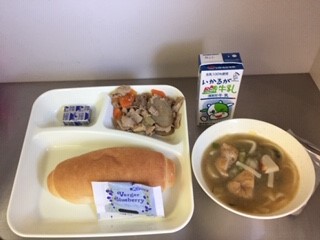 今日の給食は、コッペパン、ブルーベリージャム、牛乳、豚肉とごぼうの煮もの、なにわうどん、固形チーズ、です。