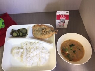 今日の給食は、ごはん、牛乳、みそ汁、いわしフライ、きゅうりの赤じそあえ、です。