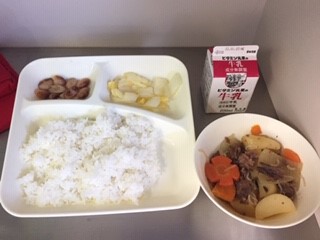 今日の給食は、ごはん、牛乳、肉じゃが、はくさいのゆず風味、とら豆の煮もの、です。