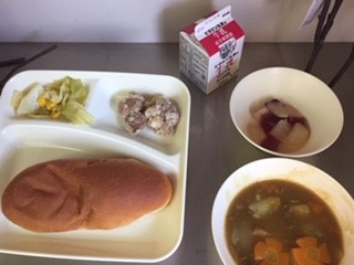 今日の給食は、黒糖パン、牛乳、フライドチキン、カレーシチュー(米粉)、キャベツとコーンのサラダ、フルーツゼリー、です。