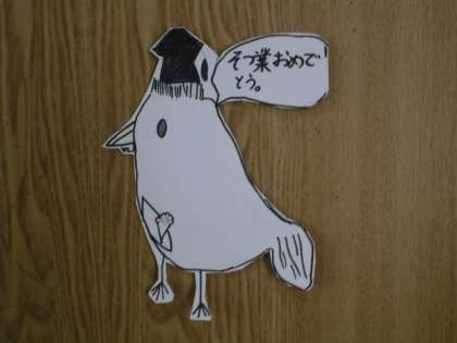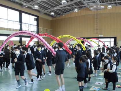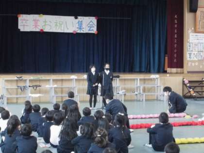 在校生で6年生をお出迎え。チョビもお祝いしに来てくれました(^^)/