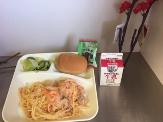 今日の給食は、黒糖パン(1/2)、牛乳、さけのクリームスパゲッティ、キャベツときゅうりのサラダ、ソフト黒豆、です。