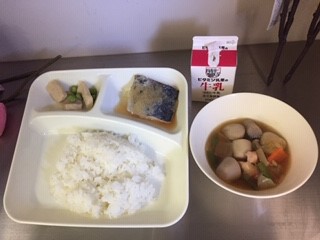 今日の給食は、ごはん、牛乳、さごしのおろしじょうゆかけ、さといもと野菜の含め煮、高野どうふの煮もの、です。