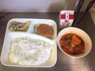 今日の給食は、ごはん、牛乳、チキンレバーカツ、ケチャップ煮、ツナとキャベツのバジルソテー、です。