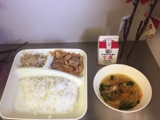 今日の給食は、ごはん、牛乳、豚肉のコチュジャンいため、鶏肉とはるさめのスープ、もやしのナムル、です。