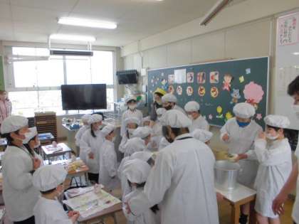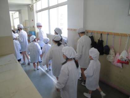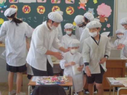 小学校で食べる初めての給食。6年生が手伝いに来てくれました!給食室まで一緒に食缶を取りに行き、配膳までサポートしてくれました(^^♪