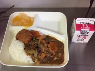 今日の給食は、カツカレーライス、牛乳、フルーツゼリー、です。