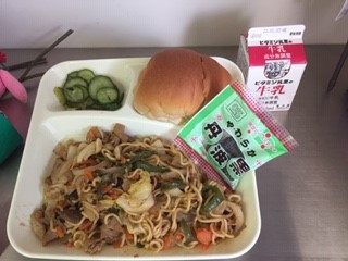 今日の給食は、黒糖パン(1/2)、牛乳、焼きそば、きゅうりのしょうがづけ、ソフト黒豆、です。